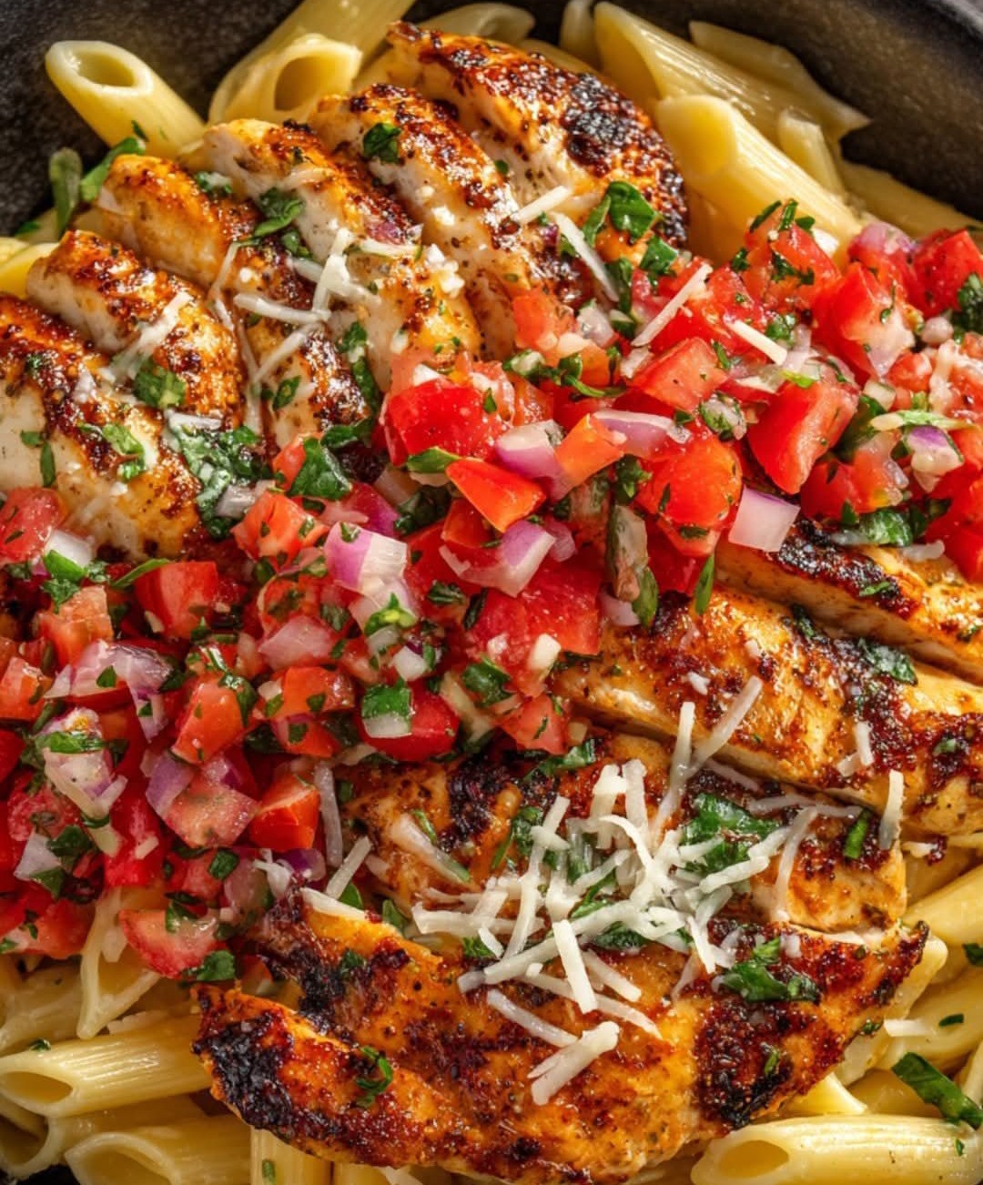 Tender seared chicken, garlicky pasta, and a bright, fresh bruschetta topping tossed together for the ultimate Italian-inspired comfort meal. Fresh, vibrant, and so satisfying