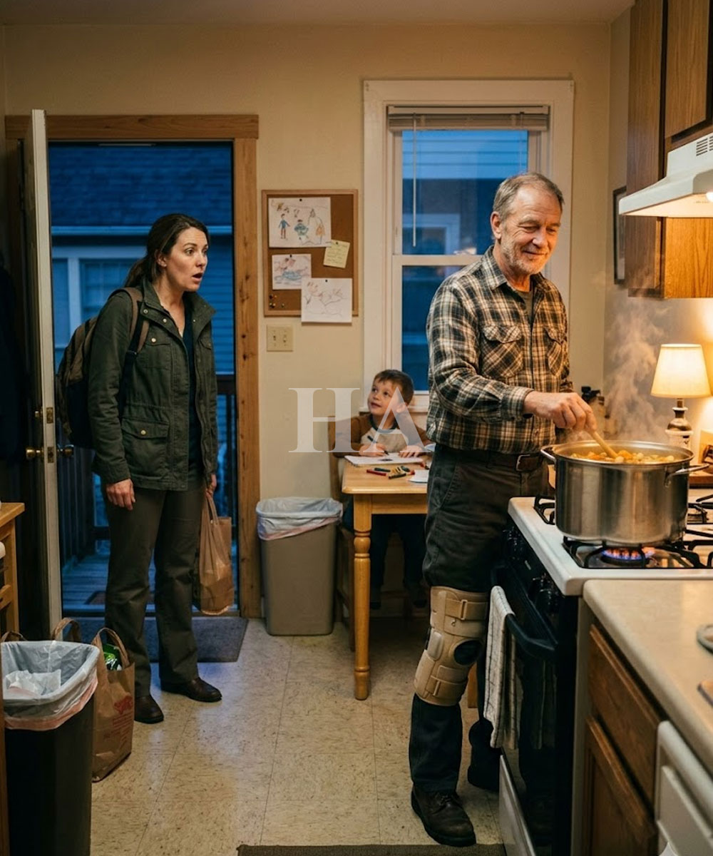 A tall man turned slowly beside the stove, balancing carefully with a medical brace strapped firmly around his knee, and for one breathless instant my mind refused to reconcile the stranger’s presence with the quiet domestic normalcy unfolding before me.