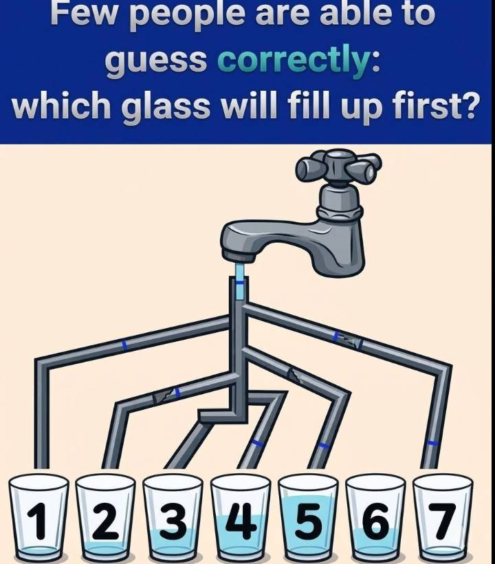 At first glance, the puzzle seems simple: several glasses are connected by pipes, water flows from a source, and the question asks which glass will fill first. Many people believe they can answer instantly by following the most obvious path.